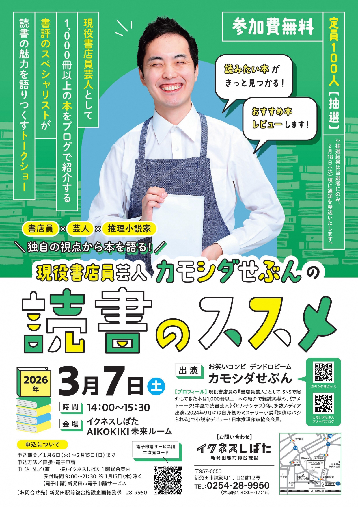現役書店員芸人として、SNSで紹介してきた本は1,000冊以上!本の紹介で雑誌掲載や、《アメトーーク!本屋で読書芸人》《ヒルナンデス》等、多数メディア出演されているカモシダせぶんさんのトークショーを開催します。読書の魅力やおすすめ本を紹介します。申込みのうえ、ぜひご参加ください。