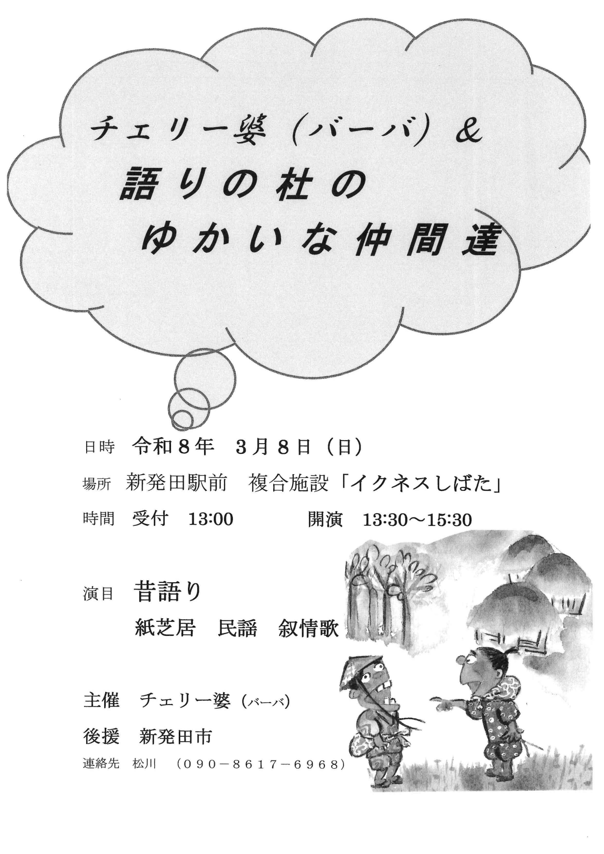 3月8日(日)に新発田市後援事業『チェリー婆(バーバ)&語りの杜のゆかいな仲間達』がイクネスしばた1階AIKOKIKI未来ルームで開催されます。お申し込みは不要です。ぜひお越しください。