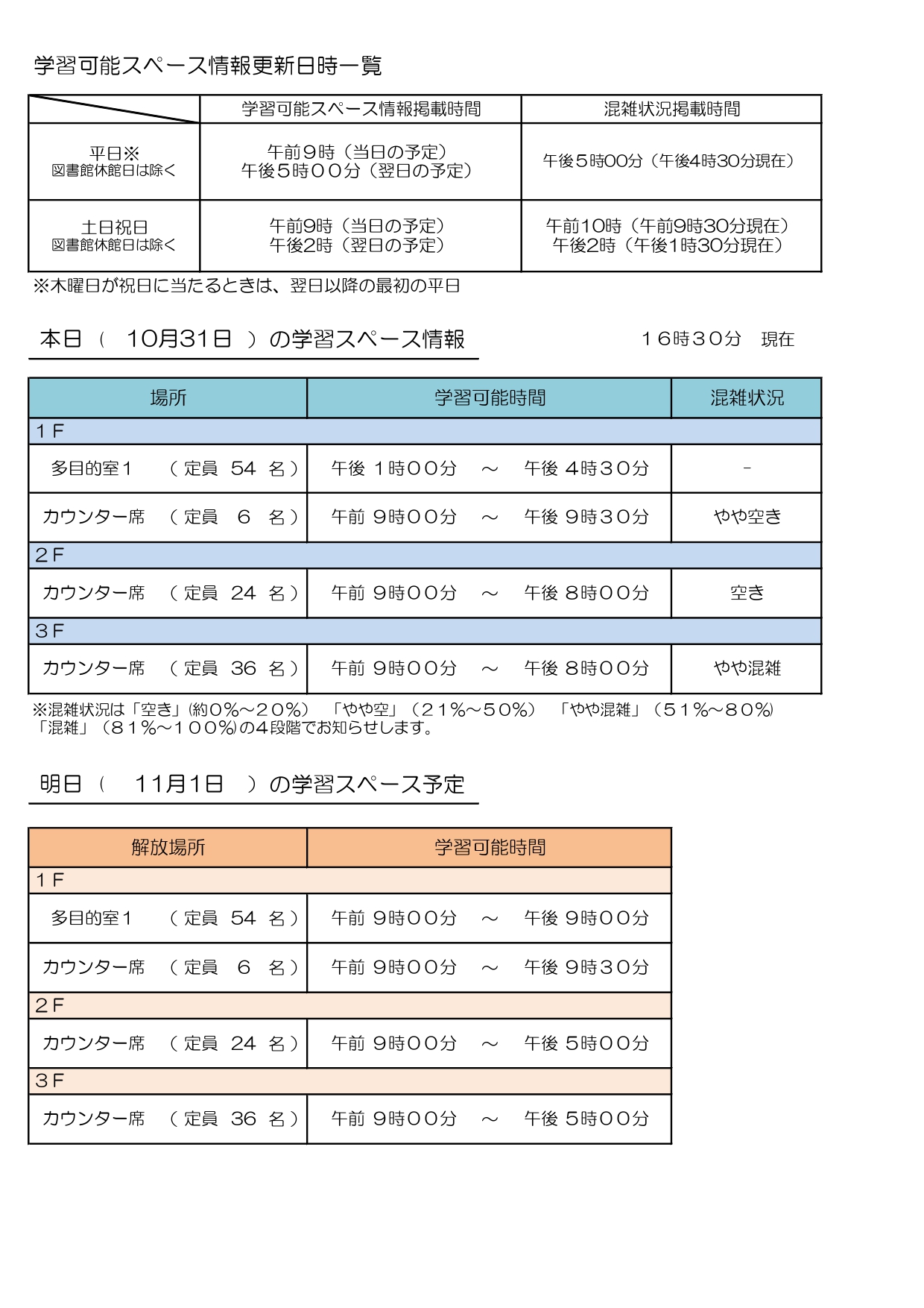 イクネスしばたの学習可能スペース情報をお知らせします。なお、カウンター席は一般の図書館利用者との兼用スペースとなっております。