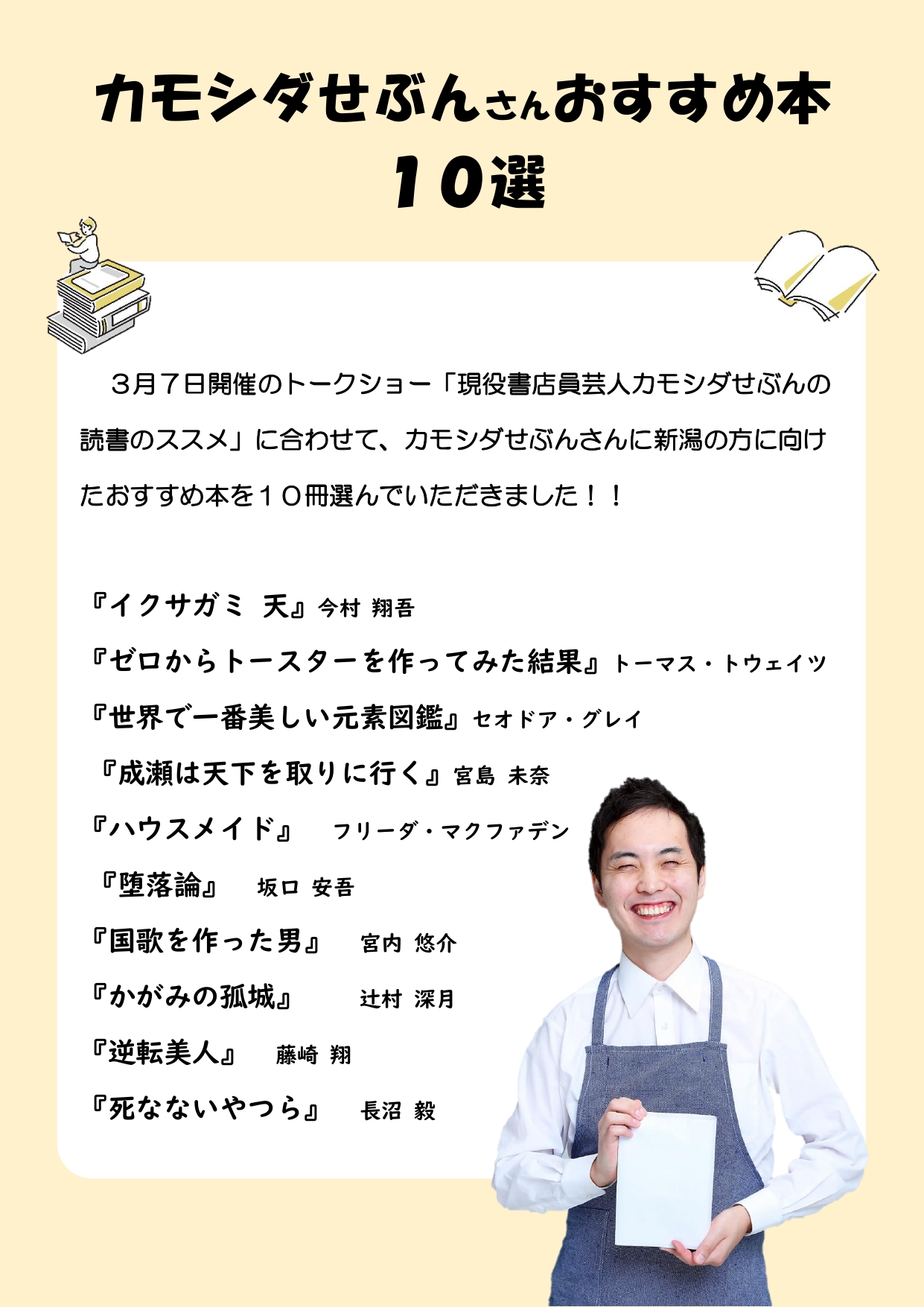 3月7日開催のトークショー「 現役書店員芸人カモシダせぶんの読書のススメ 」に合わせて 、新潟の方に向けたおすすめ本10冊をカモシダせぶんさんに選んでいただきました。当日はおすすめ本の紹介はもちろんのこと、かもしだセブンさんの読書にまつわる楽しいトークをお楽しみいただけますので、お申し込みのうえ、ぜひご参加ください!