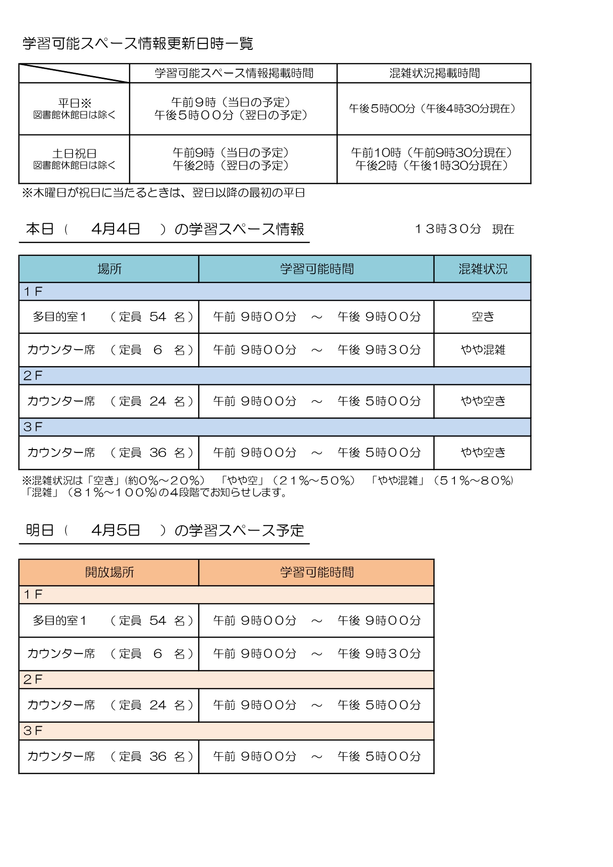 イクネスしばたの学習可能スペース情報をお知らせします。なお、カウンター席は一般の図書館利用者との兼用スペースとなっております。